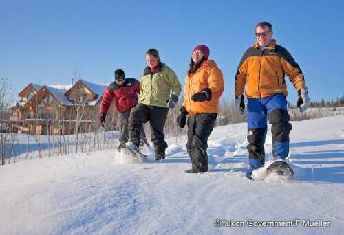 ホワイトホースに広がる雄大な自然の中をスノーシューズを履き、散策。運が良ければ、キツネや野ウサギなど