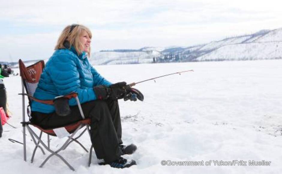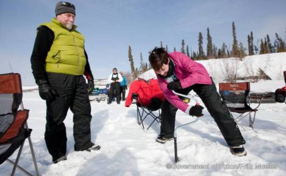 専用の道具で湖の厚い氷をガリガリ削り、氷の下の魚を狙います。