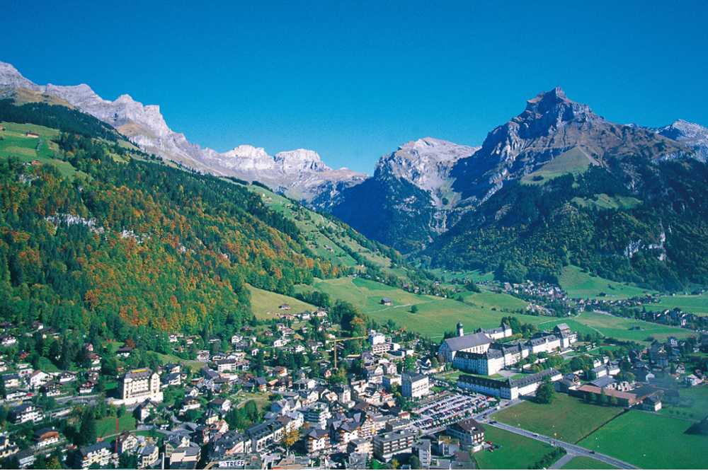 “天使の山”という意味をもつエンゲルベルクは、山に囲まれた谷間に12世紀のベネディクト派修道院を中心に発展した山里の山岳リゾートです。標高3239メートルのティトリス山への観光拠点として知られています。