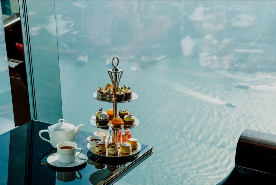 香港の絶景とともに楽しむ、ザ・リッツ・カールトン香港の優雅なアフタヌーンティー。季節のスイーツやセイボリーが並ぶ三段スタンドで、天空のラウンジならではの極上のひとときを。