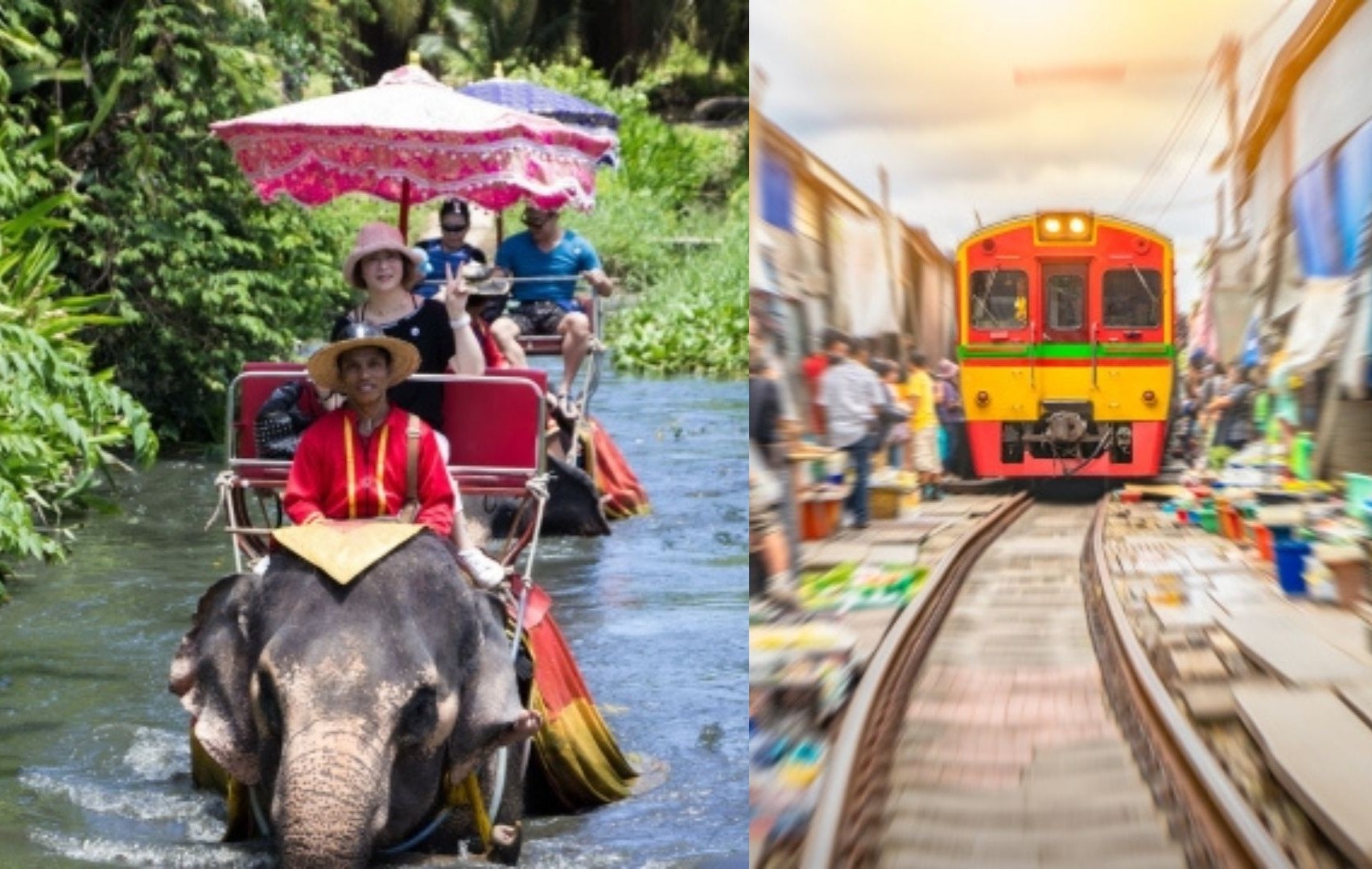 タイの2大体験!スリル満点の水上象乗り & 活気あふれる市場をゆく列車旅