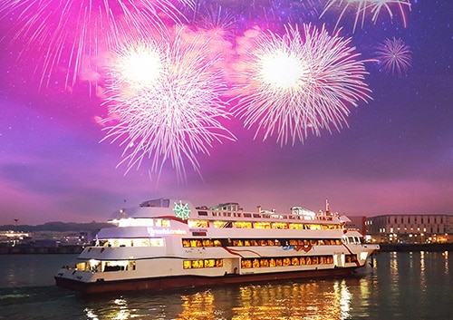 エンターテイメント満載の専属公演チームによるパフォーマンスやライブミュージックなど様々なイベントが体験できます。さらに、美味しい食事と船上から打ち上げられる華やかな花火をお楽しみいただけます。