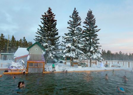 市内から30kmほど離れた場所にある広大なユーコン野生動物園では、トールシープ(白い羊)、ビックホーンバイソン、マウンテンゴート、鹿、エルク、カリブー、ムース、ジャコウウシなど、極北に生息するさまざまな動物たちが本来の環境に近い形で暮らしています。貴重な動物を間近に見学できます。温泉では、水着着用となっておりますので、水着をご持参ください。※写真はイメージです。