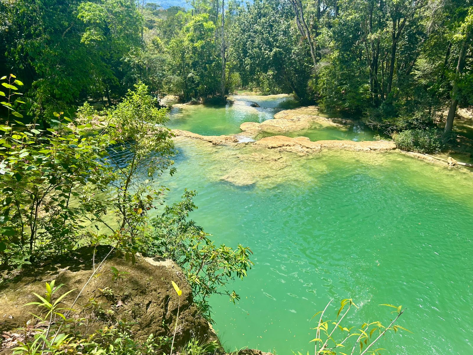 熱帯雨林に広がるアグアアスールは、石灰分を含んだ水が太陽の光を受けて美しい青色に輝く滝群です。段々に連なる滝と清流が織りなす景観は非常に美しく、チアパスを代表する自然観光地のひとつとして知られています。