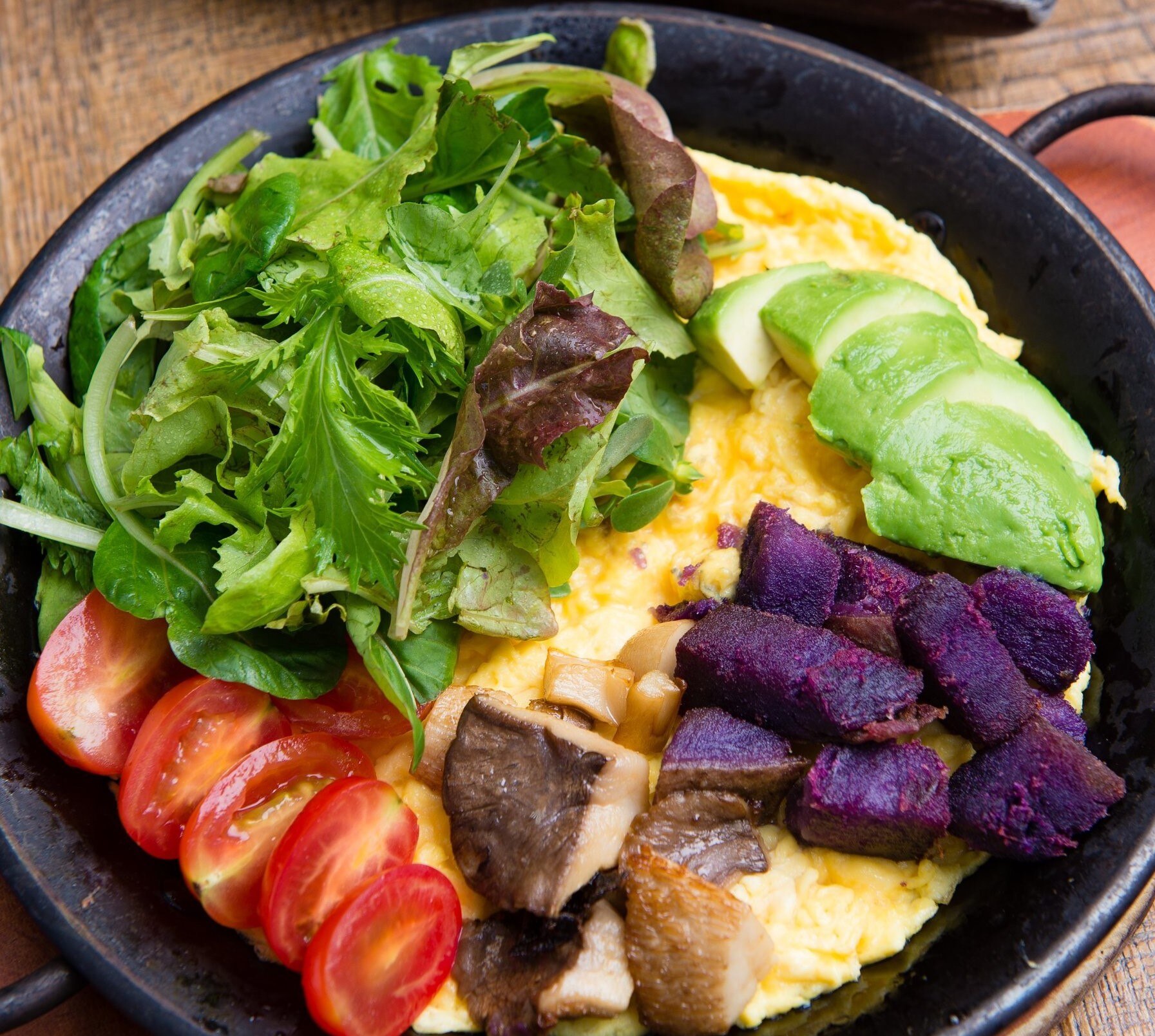 オムレツ/パンケーキ/フレンチトースト/ワッフル/スクランブルエッグ/ブレックファストミート/フルーツ/ジュース/コーヒー/紅茶
