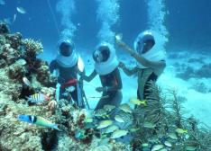 頭と肩をすっぽり包む特殊な海中ヘルメットをかぶり、水中に潜るのが、シーウォーカー。海上とはホースでつながり、随時酸素が供給されるので、酸素マスク不要。呼吸も通常と同様にラクに行えます。また、お化粧、メガネ、コンタクトレンズ等もそのままで大丈夫。泳げなくても海底をお散歩できると大人気のアクティビティです。(水深約5mの海底に、インストラクターとともに約20分間潜ります)
