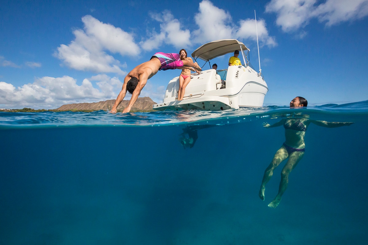 ボートからワイキキ沖にダイブして、思いっきりプライベートな時間をお楽しみください。ワイキキ沖をのんびり泳ぐウミガメや、沖に出れば豪快にジャンプしながらボートに付いてくるイルカ達に遭遇することも!船内に着替えるスペースがございますので、水着、ドレス、カジュアルな洋服などお好きな服装をご持参ください。ボート前方のバウへ出て、ワイキキやダイアモンドヘッドを眺めたり、ボート後方のスターンに座って、のんびりドリンクを飲んだりして過ごせます。