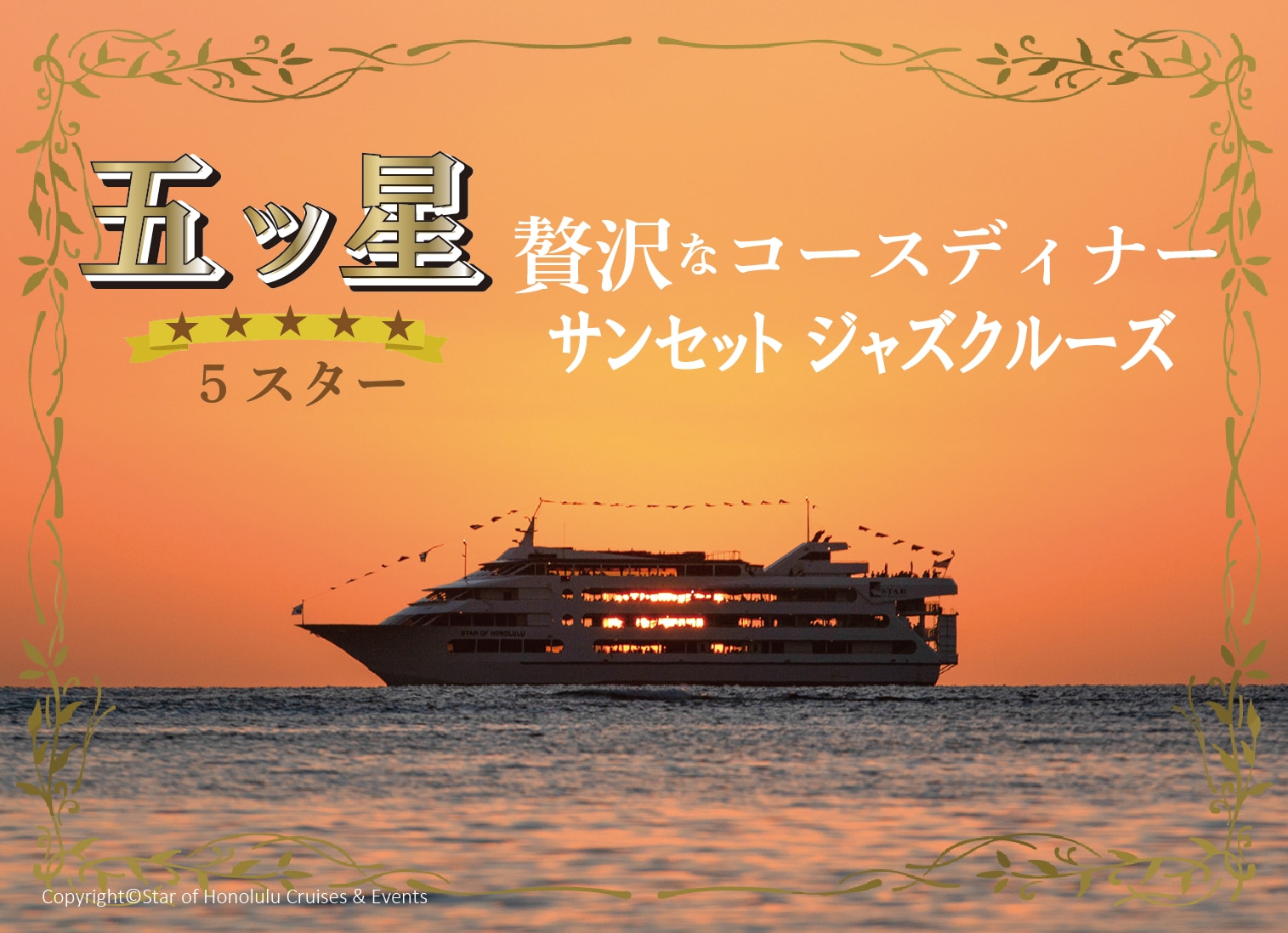 ハワイのサンセットとワイキキの夜景をバックにイルミネーションが付けられた船内ではDJがノリノリのミュージックを流し海上を盛り上げるツアー。クルーズ船には2階デッキ、タイタニック風の船首、サンセット景色、夜景を堪能できる盛沢山な内容。定員50名までのアットホームなサンセットクルーズ。フレンドリーなスタッフがお迎えします。