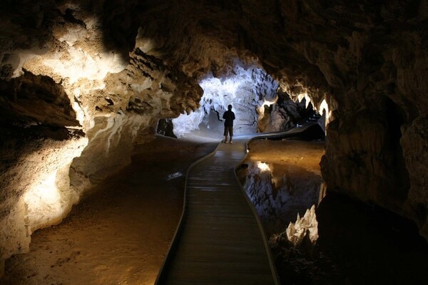 一つ目の「ツチボタルの洞窟」では、他ではなかなか体験できない、ライトを照らして土ボタルの生態を間近で見ることができます。二つ目の洞窟、美しい鍾乳洞へ向かいます。そこでは鍾乳石や石筍はもちろん、天井から差し込む幻想的な光や、なんと絶滅した巨鳥モアの骨を見る事ができます。